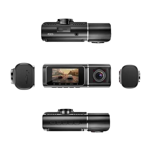 Compact 3-channel dash cam with 4K/2K front camera, 2K interior camera (130° rotating, 4 IR night vision), and Full HD rear camera. Interior records in complete darkness. Built-in Wi-Fi for smartphone control. GPS module included — records speed, time, and coordinates onto video for reliable evidence.