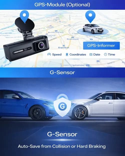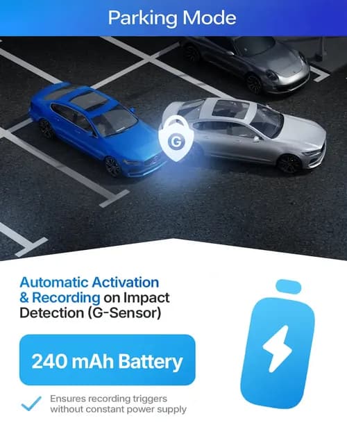 The built-in G-sensor instantly reacts to any sudden impacts — shock, collision, jolt, or hard braking. When triggered, the current video is automatically marked as protected and excluded from loop recording. This guarantees the preservation of key footage of an incident and prevents its accidental loss.