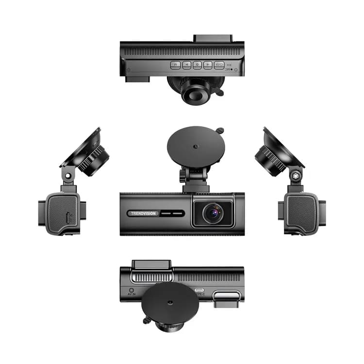 The TrendVision Phantom 3CH GPS is a compact dash cam with a triple camera system: a 4K/2K front camera, a 2K/Full HD interior camera (130° rotating and 4 IR LEDs for nighttime recording), and a remote Full HD rear camera. The interior camera records what's happening inside the car, even in complete darkness.