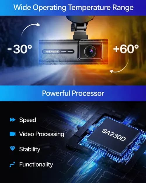The TrendVision Phantom 3CH GPS runs on a powerful SA230D processor, which ensures high device stability, fast video processing, and correct operation of all functions without delays. Thanks to the processor's high performance, the dash cam confidently handles simultaneous recording from three cameras, complex scenes, and long trips, maintaining recording smoothness and stability in all modes.