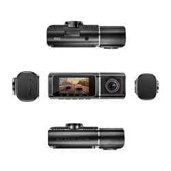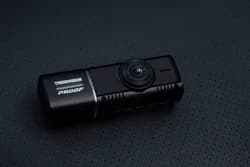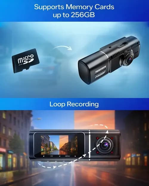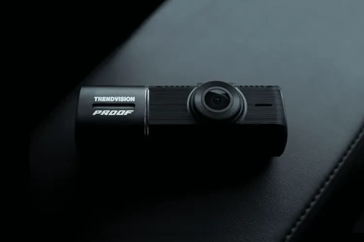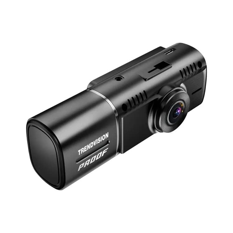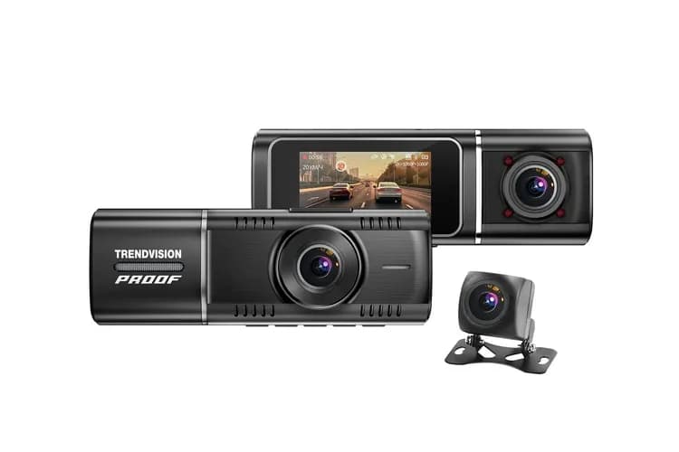 The TrendVision Proof Ultra is a compact dash cam with three cameras: a front-facing 4K/2K camera, an interior 2K/Full HD camera (250° rotation with 4 IR LEDs), and a remote rear Full HD camera. The interior camera provides improved nighttime footage inside the car.