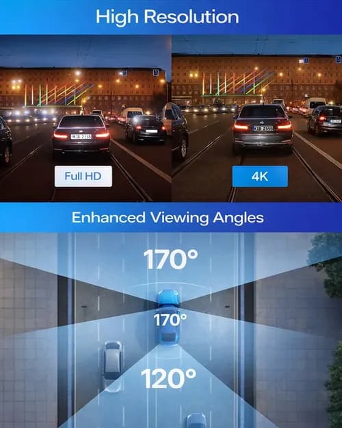 The viewing angle of the built-in cameras — 170° for the front and 170° for the cabin — allows you to cover the widest possible sector in front of the car and the entire interior space. The external rear camera has a 120° angle, capturing what is happening behind the vehicle, including adjacent lanes and pedestrian zones. This coverage provides a complete picture of events around the car in any situation.