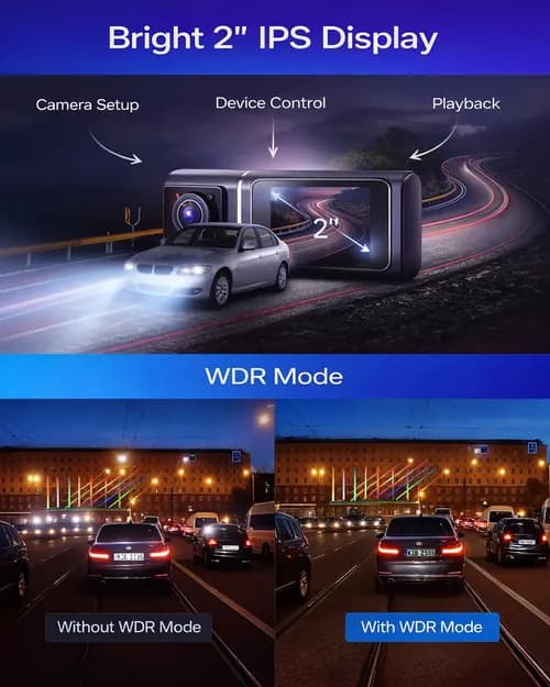 The bright and contrast-rich 2" display provides convenient device control: it's easy to adjust settings, view recordings, and monitor the dash cam's operation. The screen brightness is calibrated so that it does not blind the driver at night while remaining perfectly readable in direct sunlight.