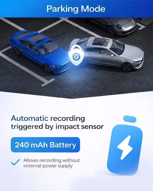 The built-in G-sensor reacts to any sudden impacts — shock, collision, hard braking, or jolt. When triggered, the current video is automatically marked as protected and excluded from loop recording. This guarantees that important footage of an incident will be saved and not lost.