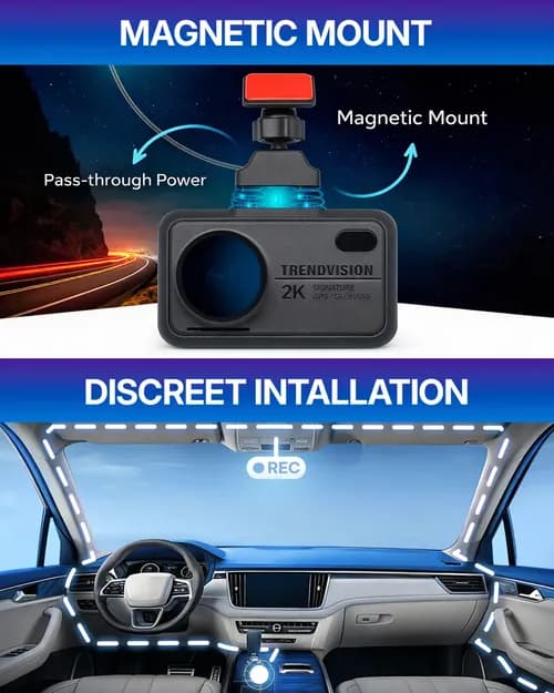 The holder with built-in neodymium magnets allows you to remove and install the dash cam in an instant, with one hand, effortlessly. No time wasted on screws, clamps, or brittle latches. The set shooting angle does not get misaligned. The magnetic holder ultimately protects your car from car thieves, because there is no dash cam on the glass — and it does not attract unnecessary attention. Two bracket options are included in the kit — one with 3M adhesive tape and one with a vacuum suction cup.