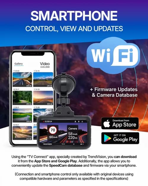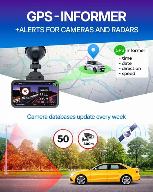 The information system based on the built-in database warns about 16 types of objects. The driver will always know exactly what type of complex is ahead — a regular camera, average speed control, traffic light camera, stop monitoring camera, etc. The dash cam's memory contains information about objects worldwide. The database is updated weekly. The GPS informant warns, among others, about cameras without a radar unit such as (Robot, Multiradar), which cannot be detected by a regular radar detector.