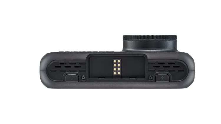 The mount is designed with passthrough power — meaning the cable plugs into the connector on the holder, not into the dash cam body. The device itself is freed from wires, which also contributes to its quick-release capability.