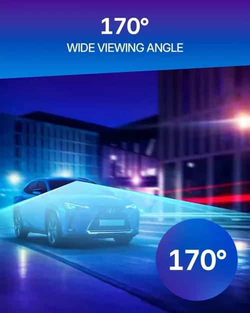 170 degrees diagonally — complete coverage of what is happening on the sides of the hood. Extremely informative video without distortion at the edges of the frame. A wide viewing angle is especially important in the city when it comes to auto scammers. The dash cam will capture "from start to finish" how an intruder hides behind a parked car and then throws himself under the wheels of your vehicle.