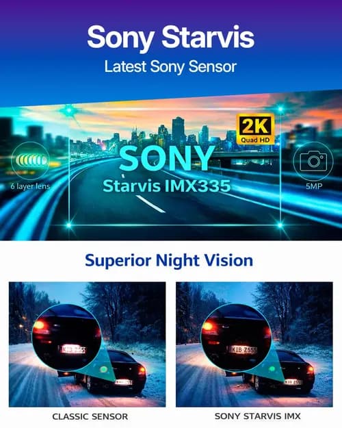 The maximum video resolution is 2K, 2560x1440 pixels. This is almost 1.5 times sharper than Full HD recording! License plates can be distinguished at a distance of up to 17 meters. Excellent recording quality, including at dusk and in darkness, is ensured by the latest generation Sony Starvis IMX335 sensor with high light sensitivity and a fast 7-lens Taiwanese lens with f/1.8 aperture.