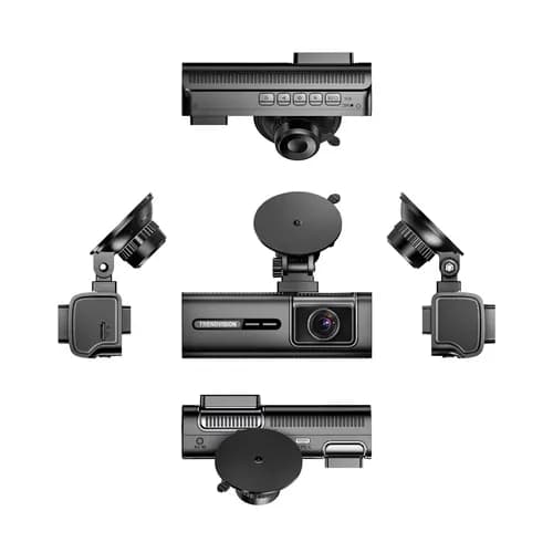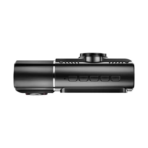 Compact 3-channel dash cam with 4K/2K front camera, 2K interior camera (130° rotating, 4 IR night vision), and Full HD rear camera. Interior records in complete darkness. Built-in Wi-Fi for smartphone control. GPS module included — records speed, time, and coordinates onto video for reliable evidence.
